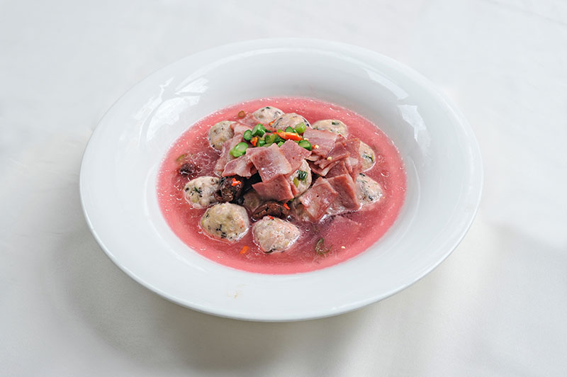 4.熱油將丸子炸到表皮變黃后撈出,倒入紅菇湯中,加入適量食鹽,開鍋后,倒入培根丁,即可出鍋。