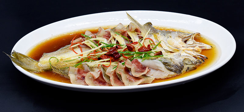 2.將培根解凍切片,將培根片塞入桂魚表面的劃口中。并放入蒸鍋中清蒸;