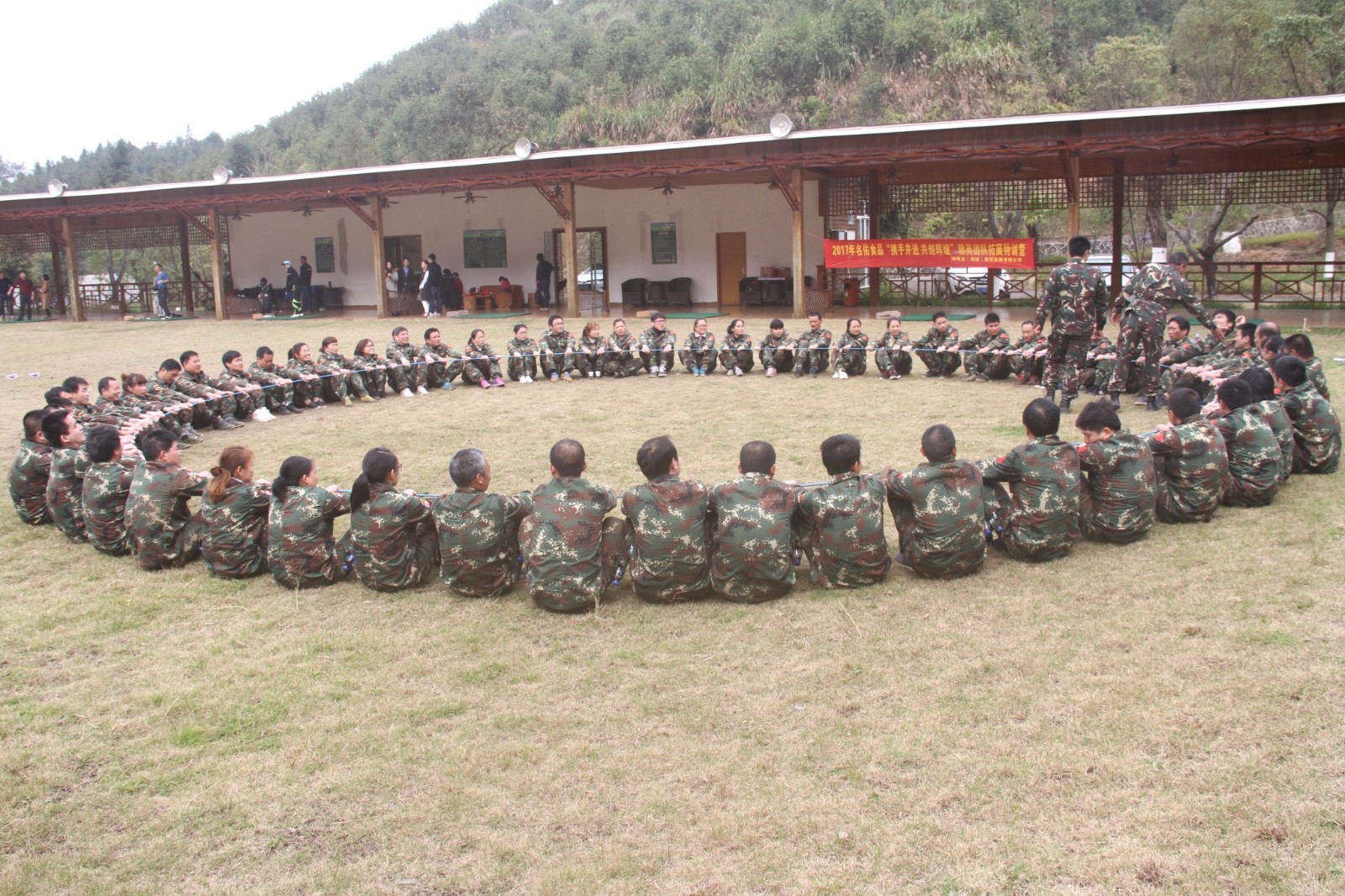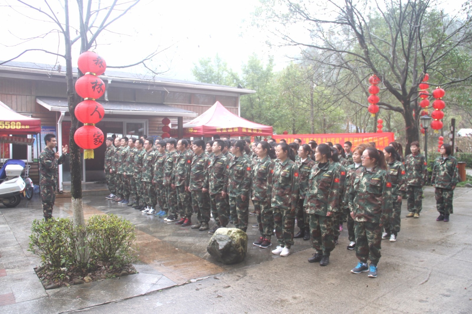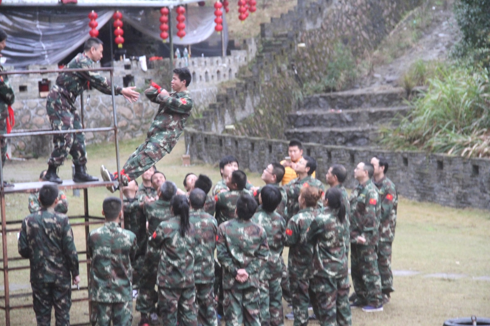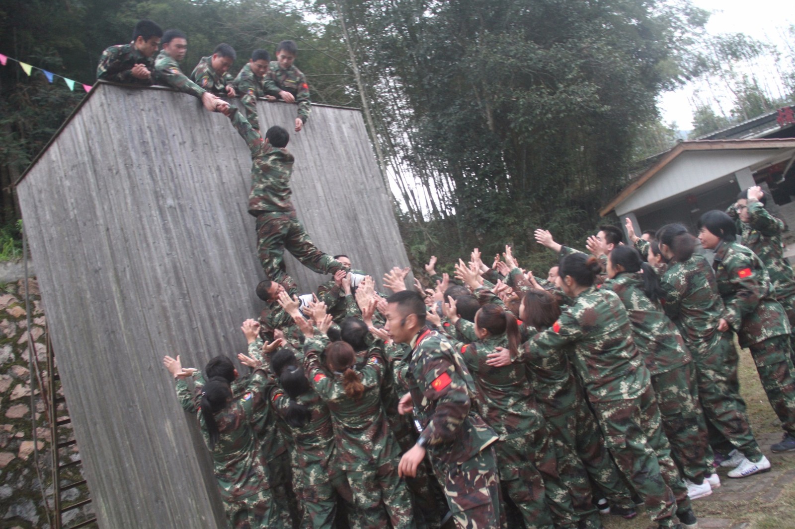 第一天團隊統一著裝迷彩服,進行團隊組建并建立統一的團隊目標。參加心情撲克牌、高空抓桿、盜夢空間、七巧板等項目。