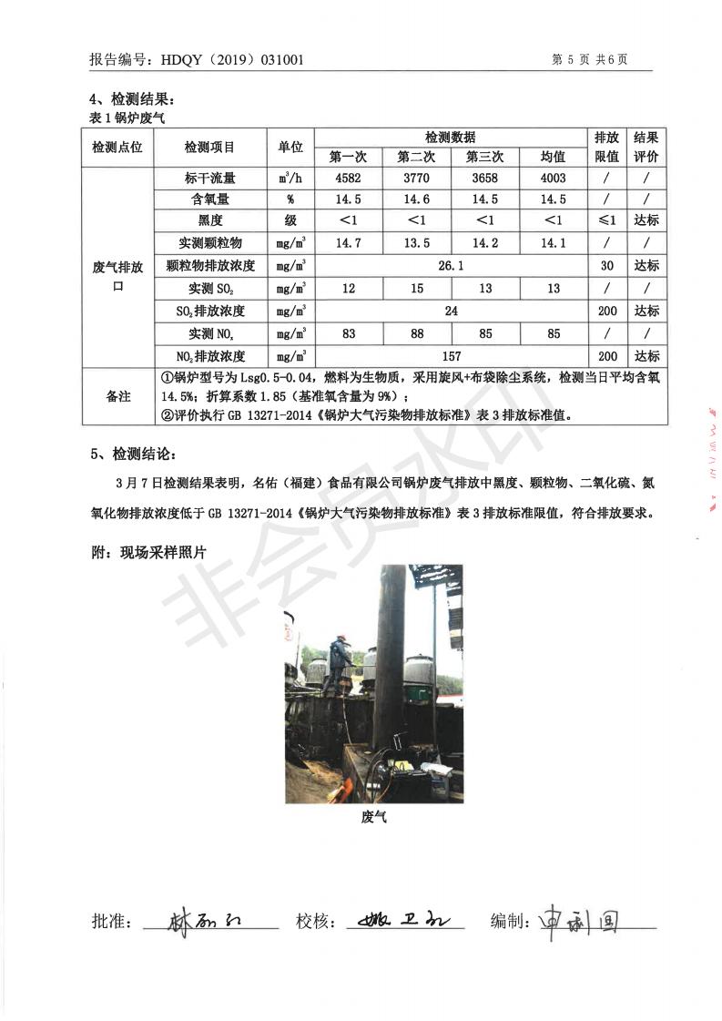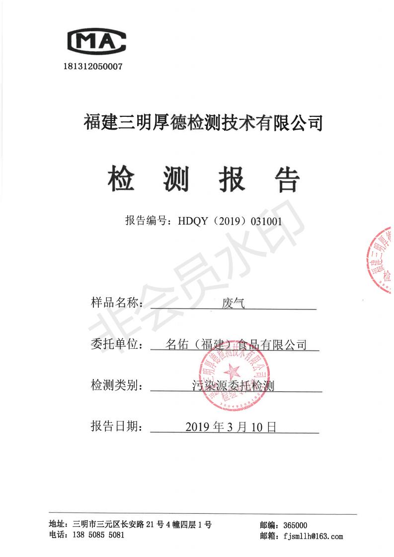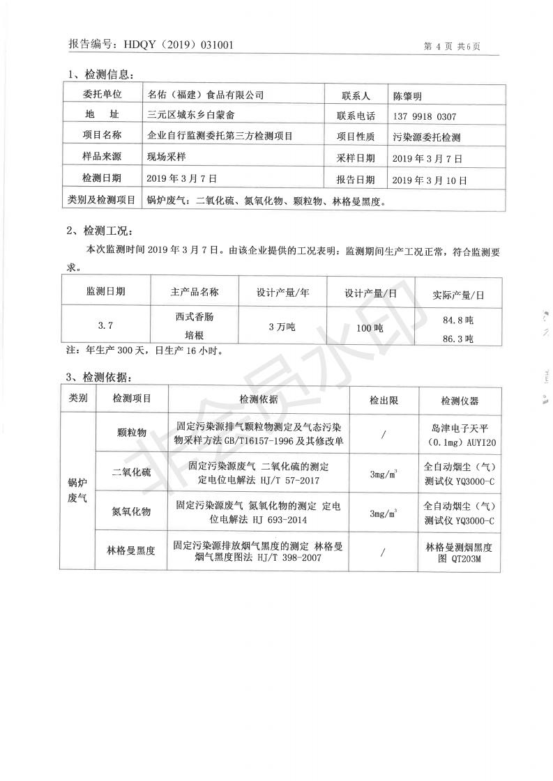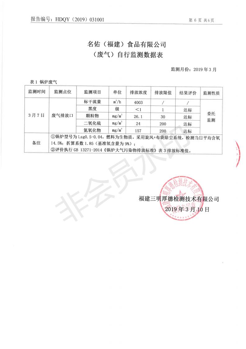 名佑(福建)食品有限公司2019年度3月環境自行監測信息